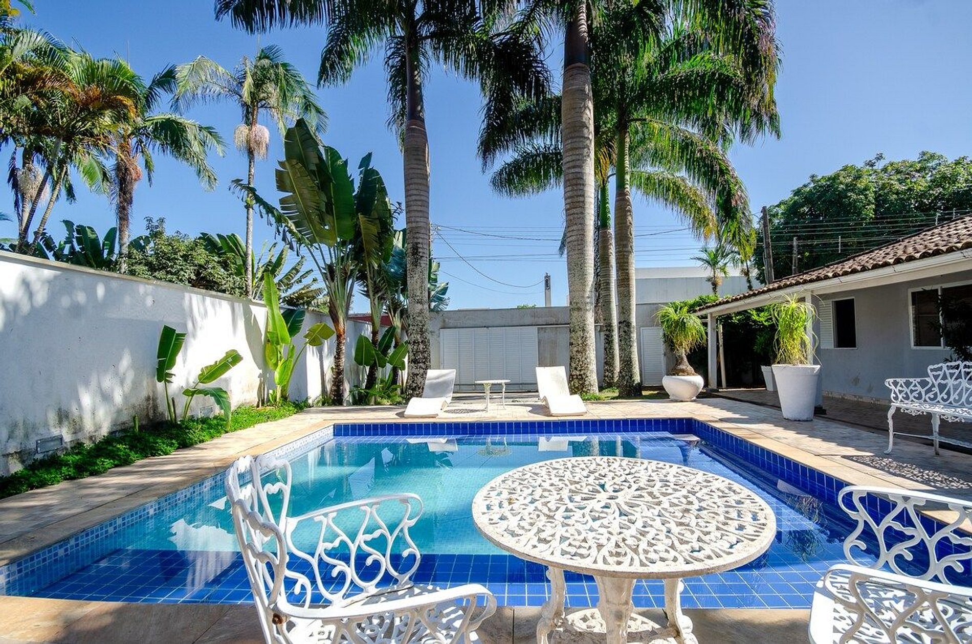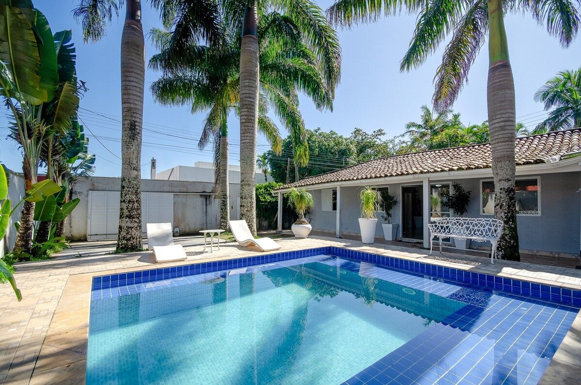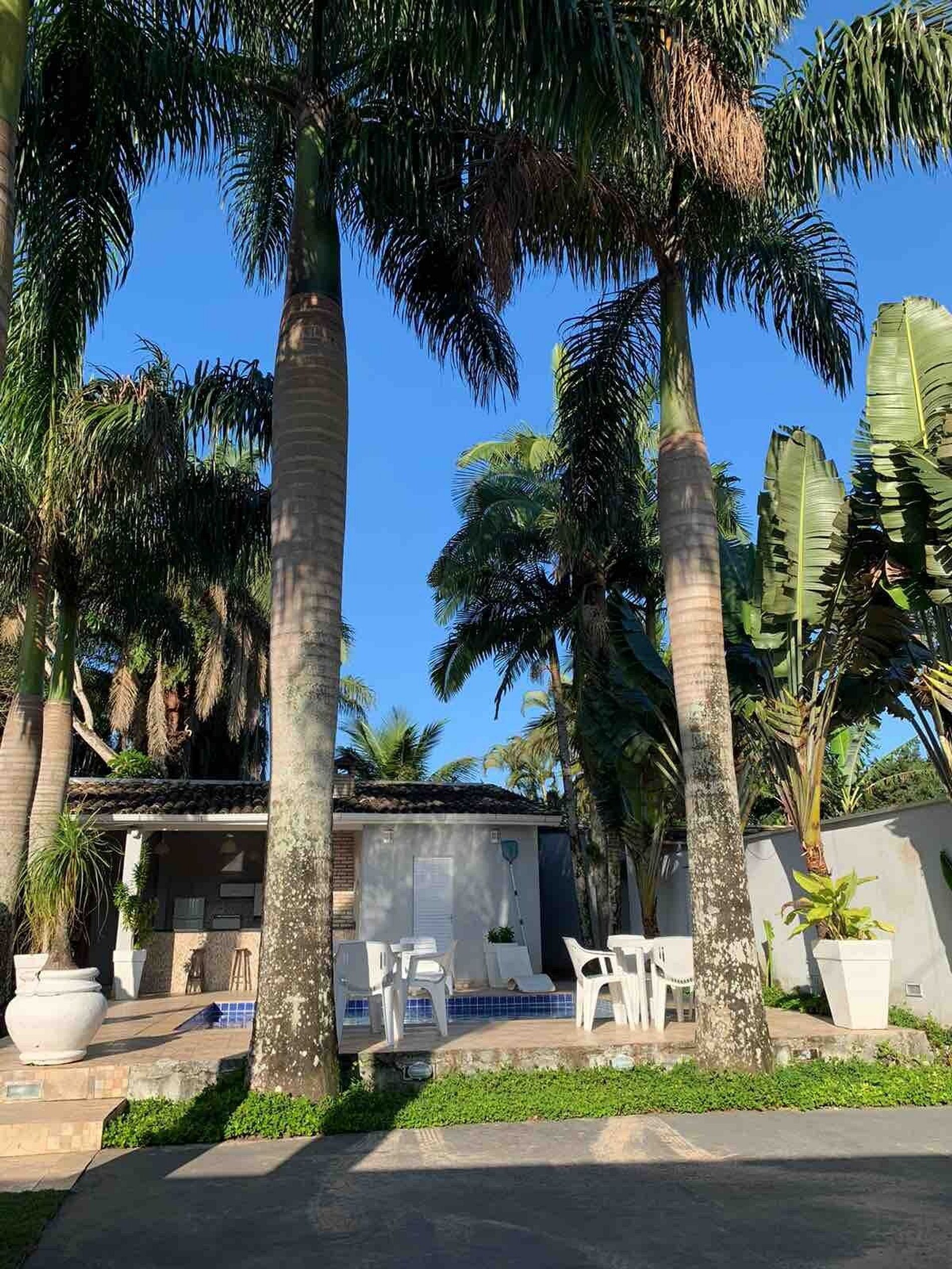 Casa totalmente térrea com acomodação para 16 pessoas EM CAMAS, distribuídas em 4 dormitórios sendo 1 suíte, 2 banheiros, sala de estar, cozinha tipo americana, espaço gourmet, bar para piscina, vestiário, garagem para 6 carros, paisagismo, piscina, churrasqueira. Casa foi recém reformada, colchões novos, todos utensílios de cozinha, tudo pensado para uma estadia muito confortável. O projeto de paisagismo e iluminação se torna um diferencial. Estamos localizados em frente ao GOLF CLUB DO GUARUJA, a menos de 350m da praia, cerca de 5min caminhando, a 300m de todo tipo de comércios (bares, restaurantes, casas noturnas, supermercados, farmácias e padarias).