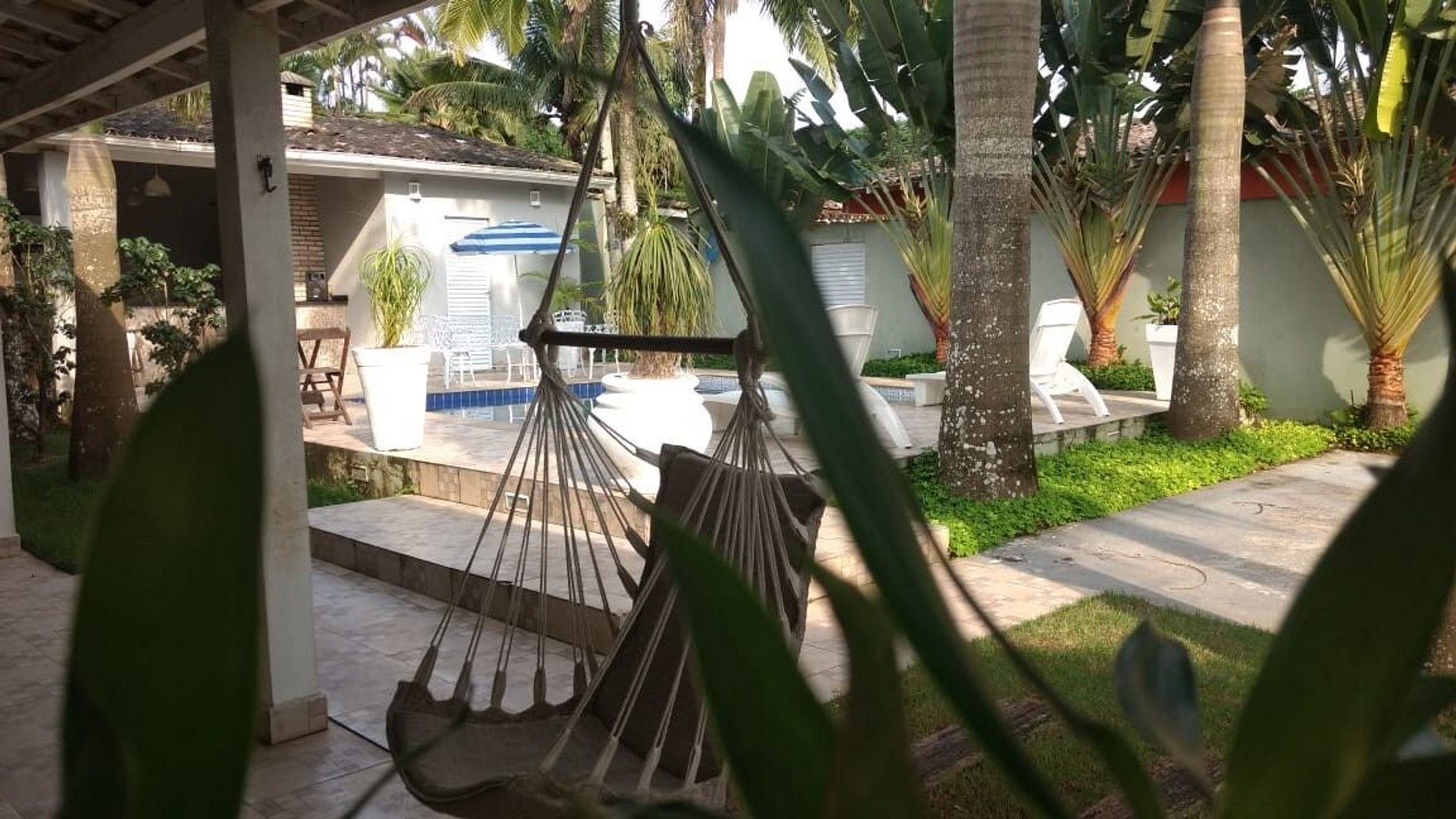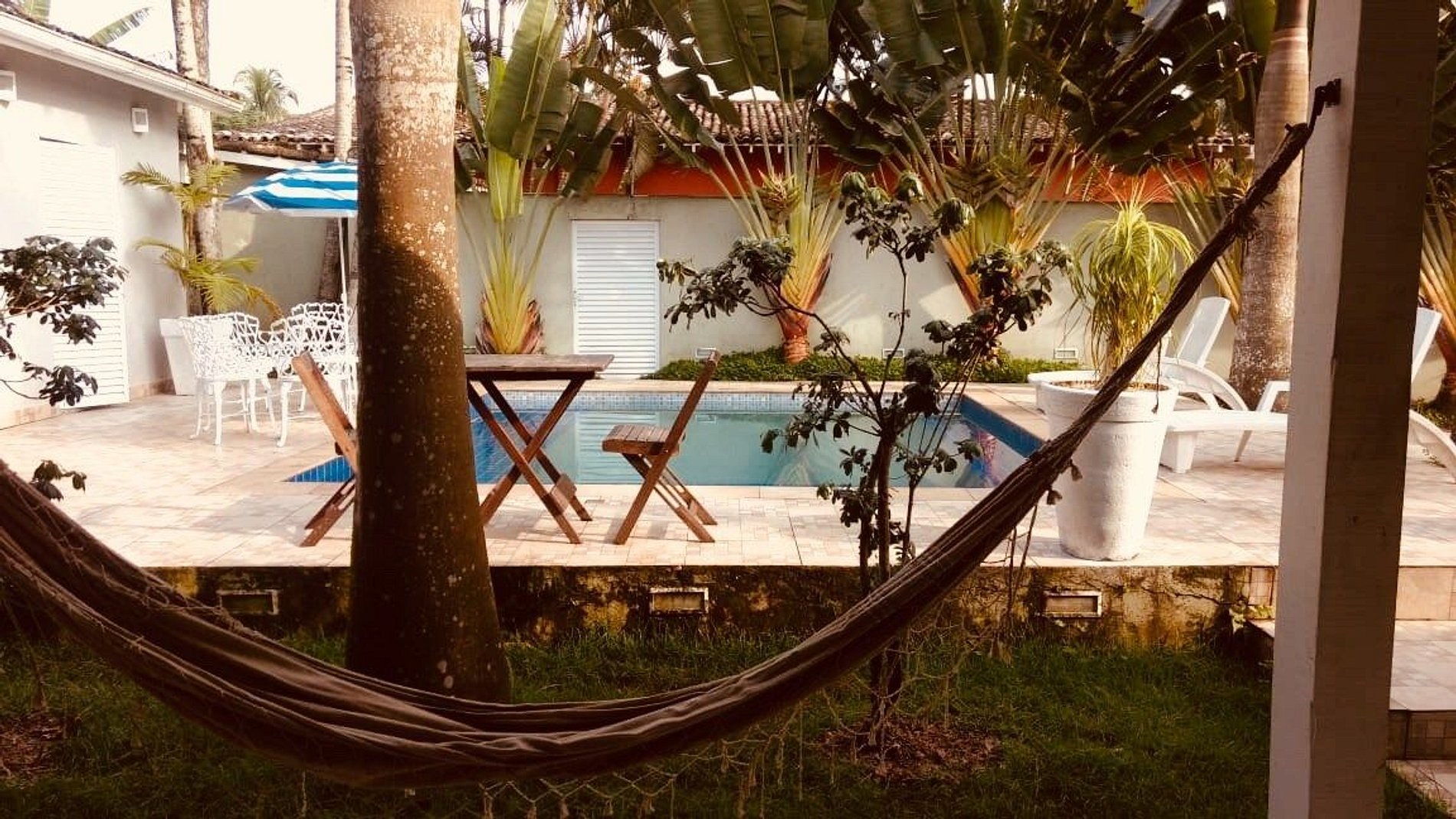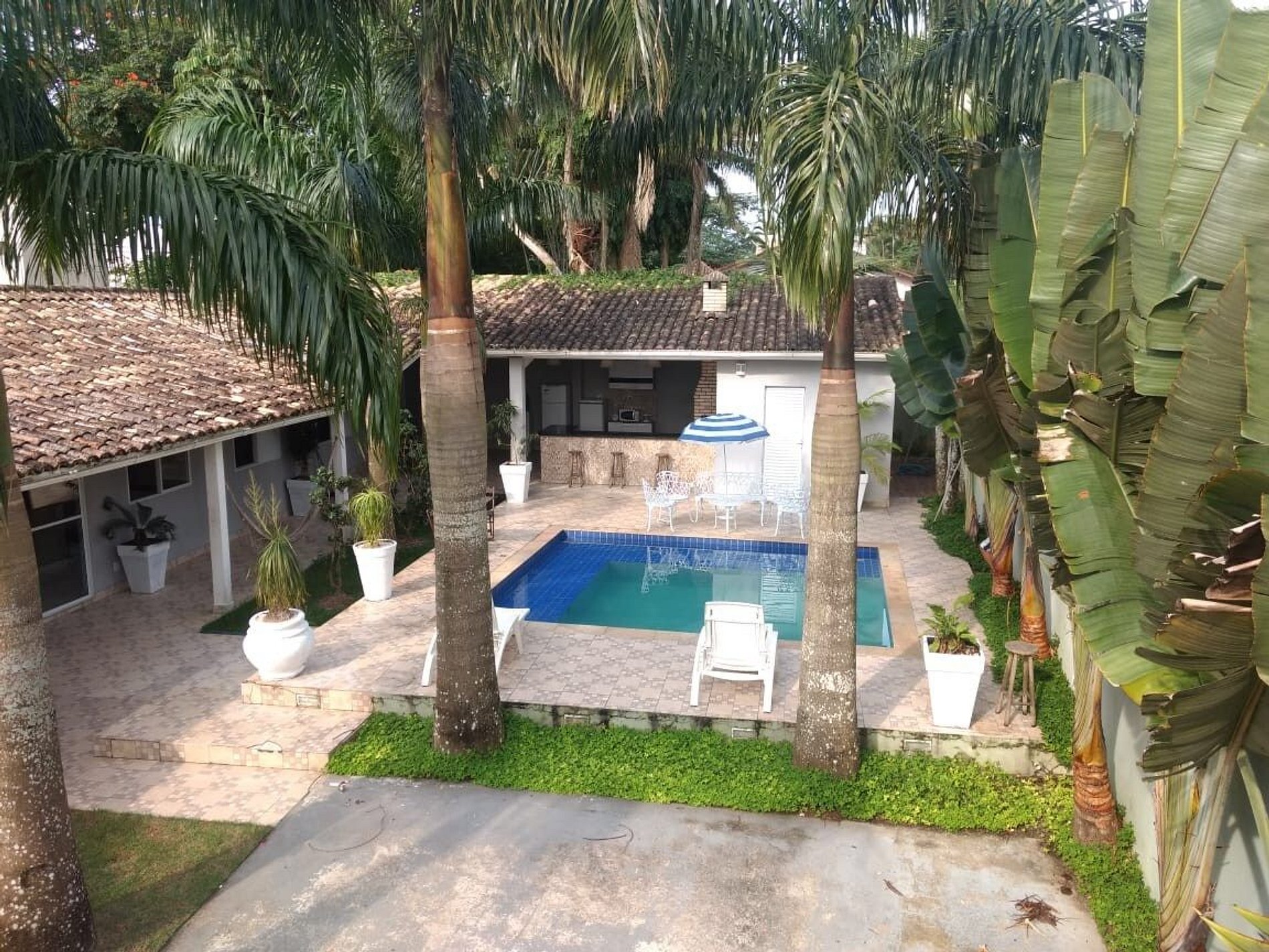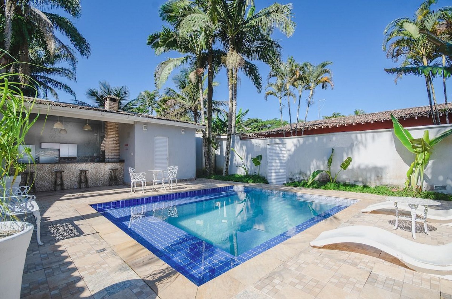 Casa totalmente térrea com acomodação para 16 pessoas EM CAMAS, distribuídas em 4 dormitórios sendo 1 suíte, 2 banheiros, sala de estar, cozinha tipo americana, espaço gourmet, bar para piscina, vestiário, garagem para 6 carros, paisagismo, piscina, churrasqueira. Casa foi recém reformada, colchões novos, todos utensílios de cozinha, tudo pensado para uma estadia muito confortável. O projeto de paisagismo e iluminação se torna um diferencial. Estamos localizados em frente ao GOLF CLUB DO GUARUJA, a menos de 350m da praia, cerca de 5min caminhando, a 300m de todo tipo de comércios (bares, restaurantes, casas noturnas, supermercados, farmácias e padarias).